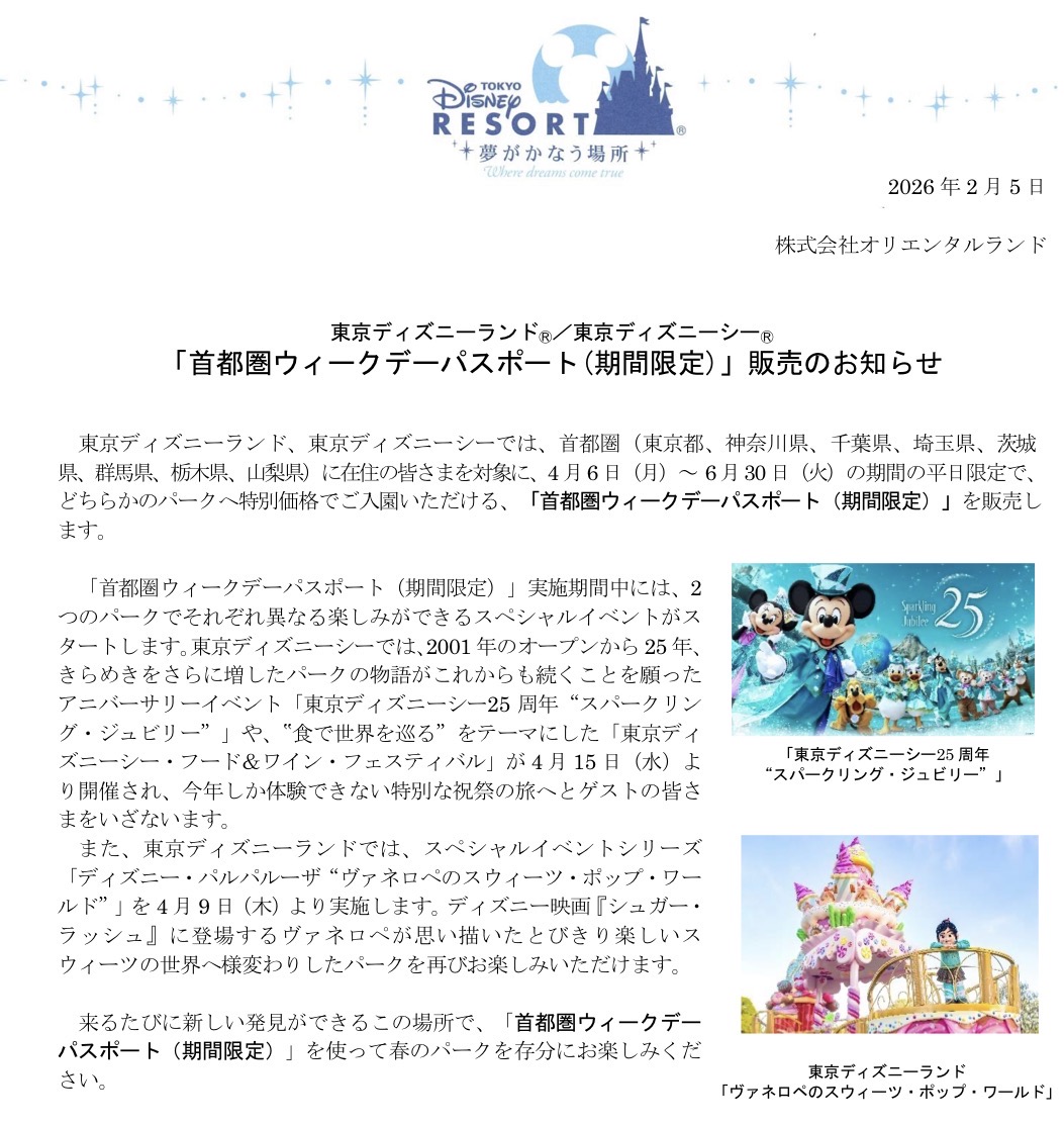 【最大1,000円OFF】首都圏ウィークデーパスポート2026年春販売開始!TDS25周年も楽しめる